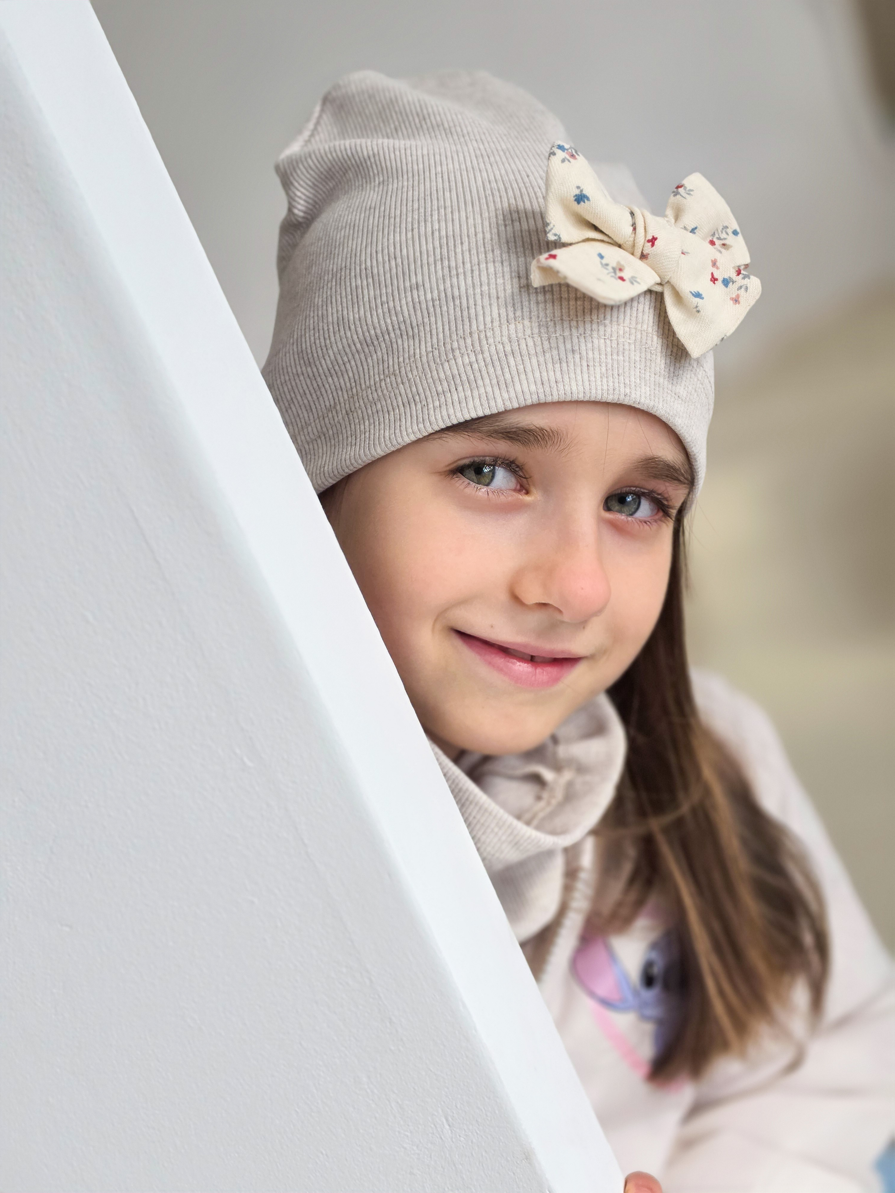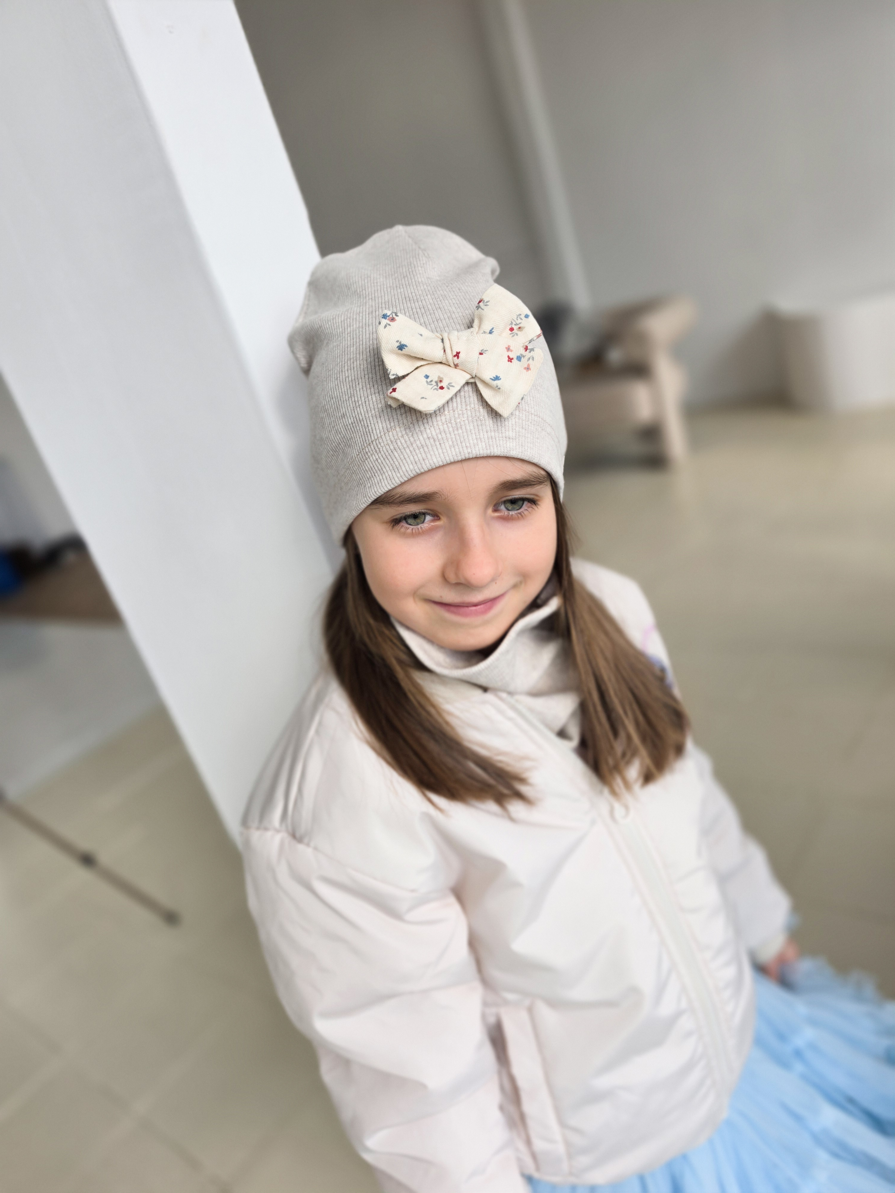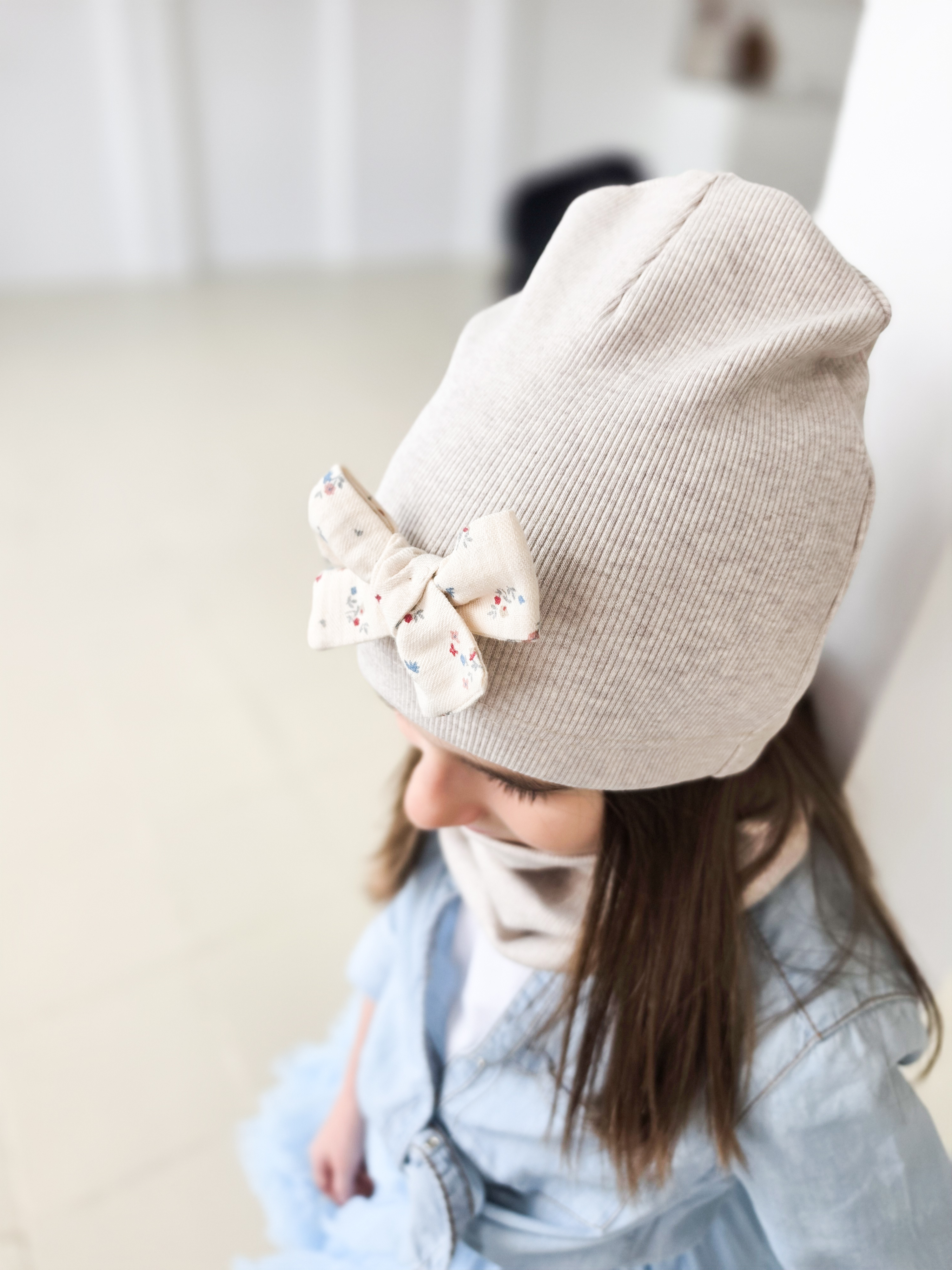Czapka typu smerfetka z kokardką w kwiatki.