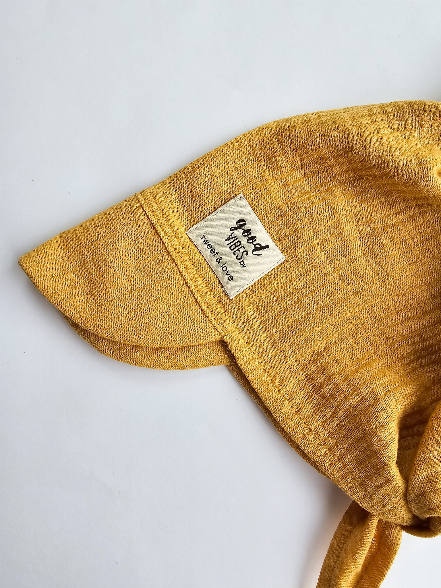 Muślinowa musztardowa chustka z daszkiem.