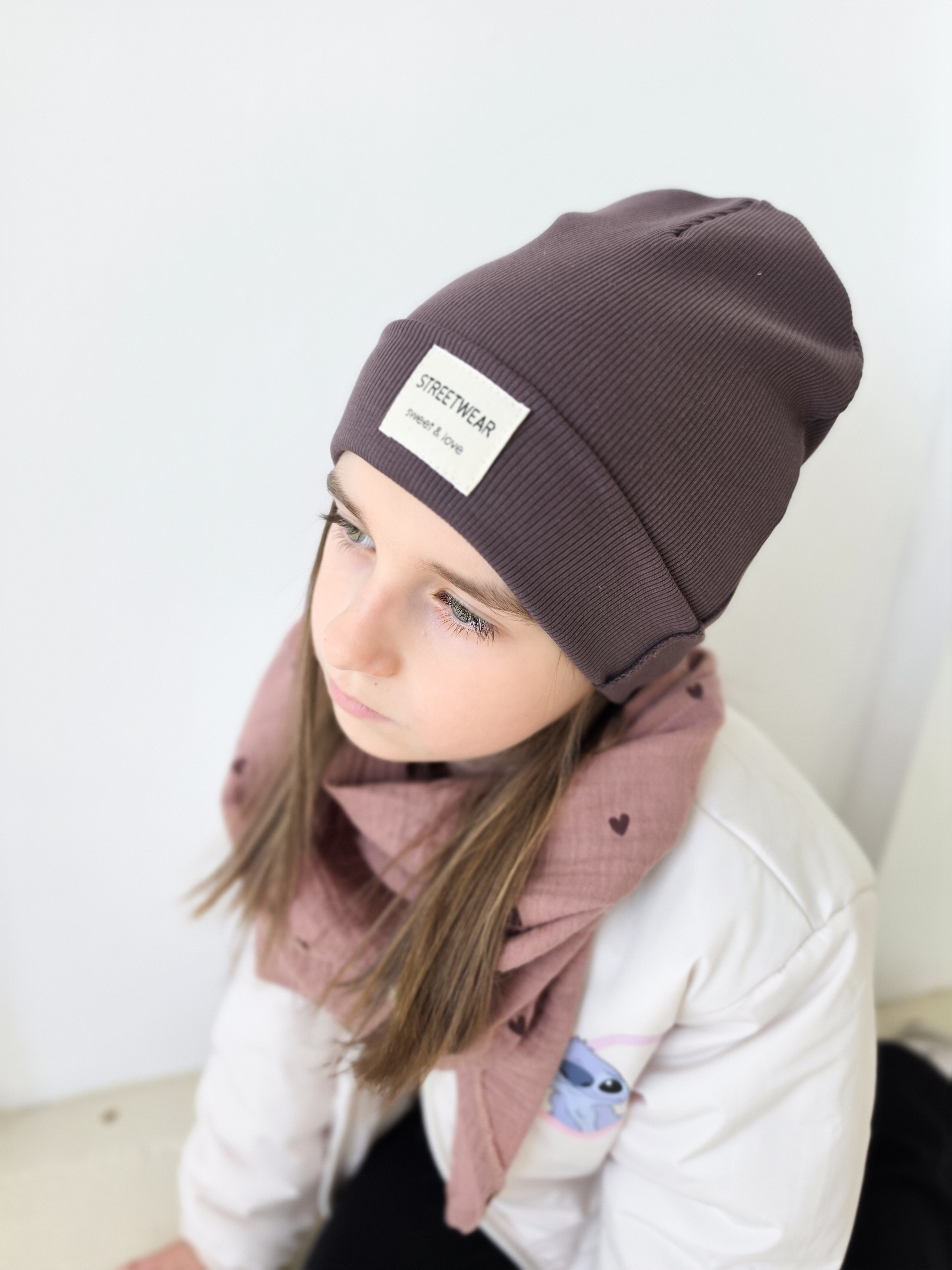 Czapka jednowarstwowa z wywinięciem. Uszyta z dzianiny typu ściągacz prążkowany