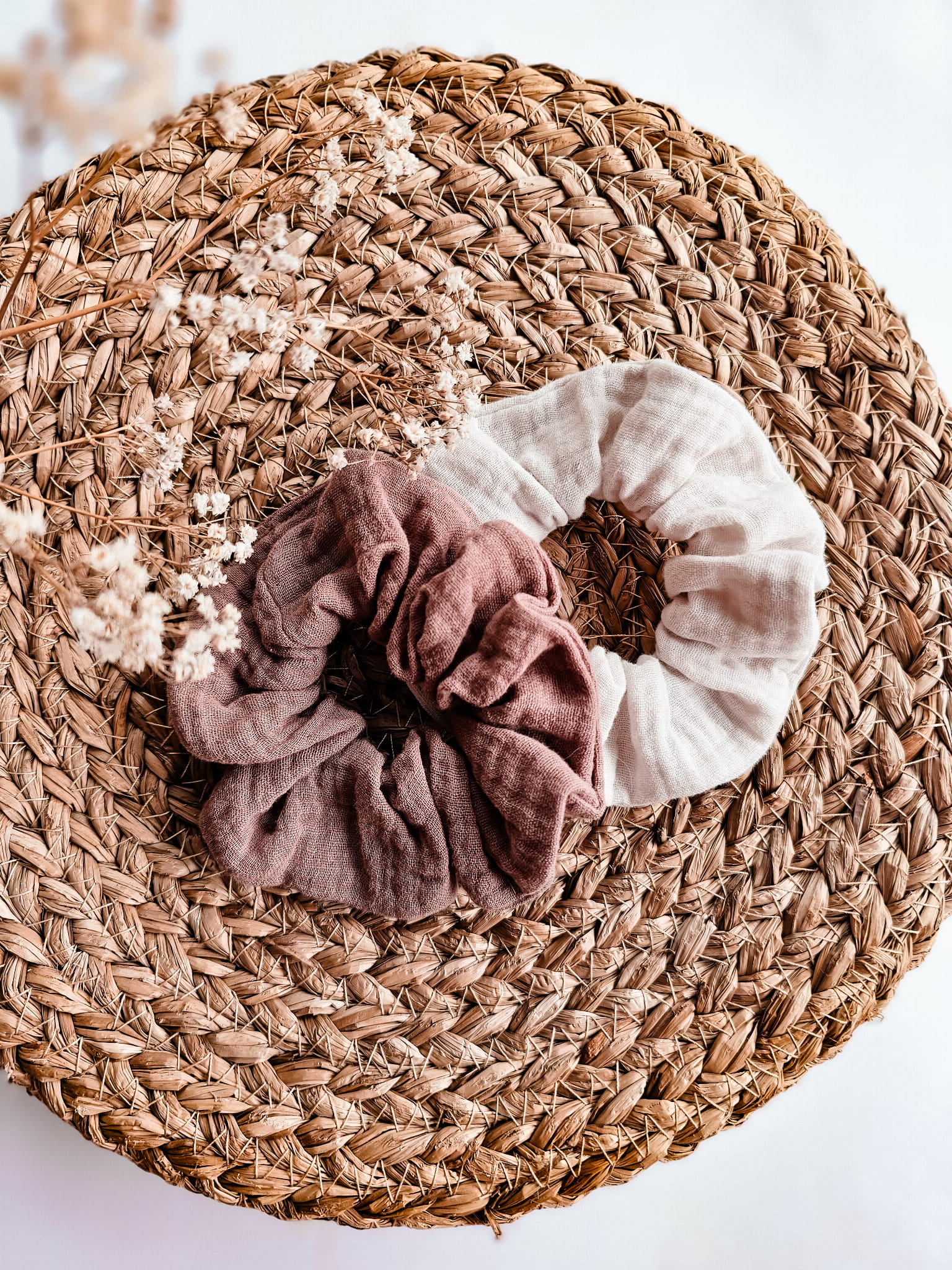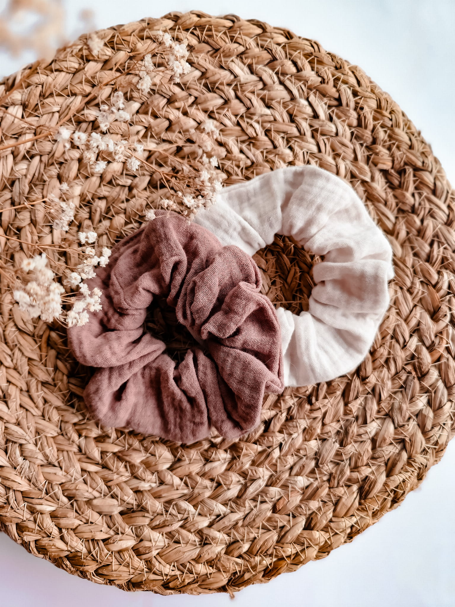 2 Pack zawiera: dwie gumki scrunchie uszyte z muślinu