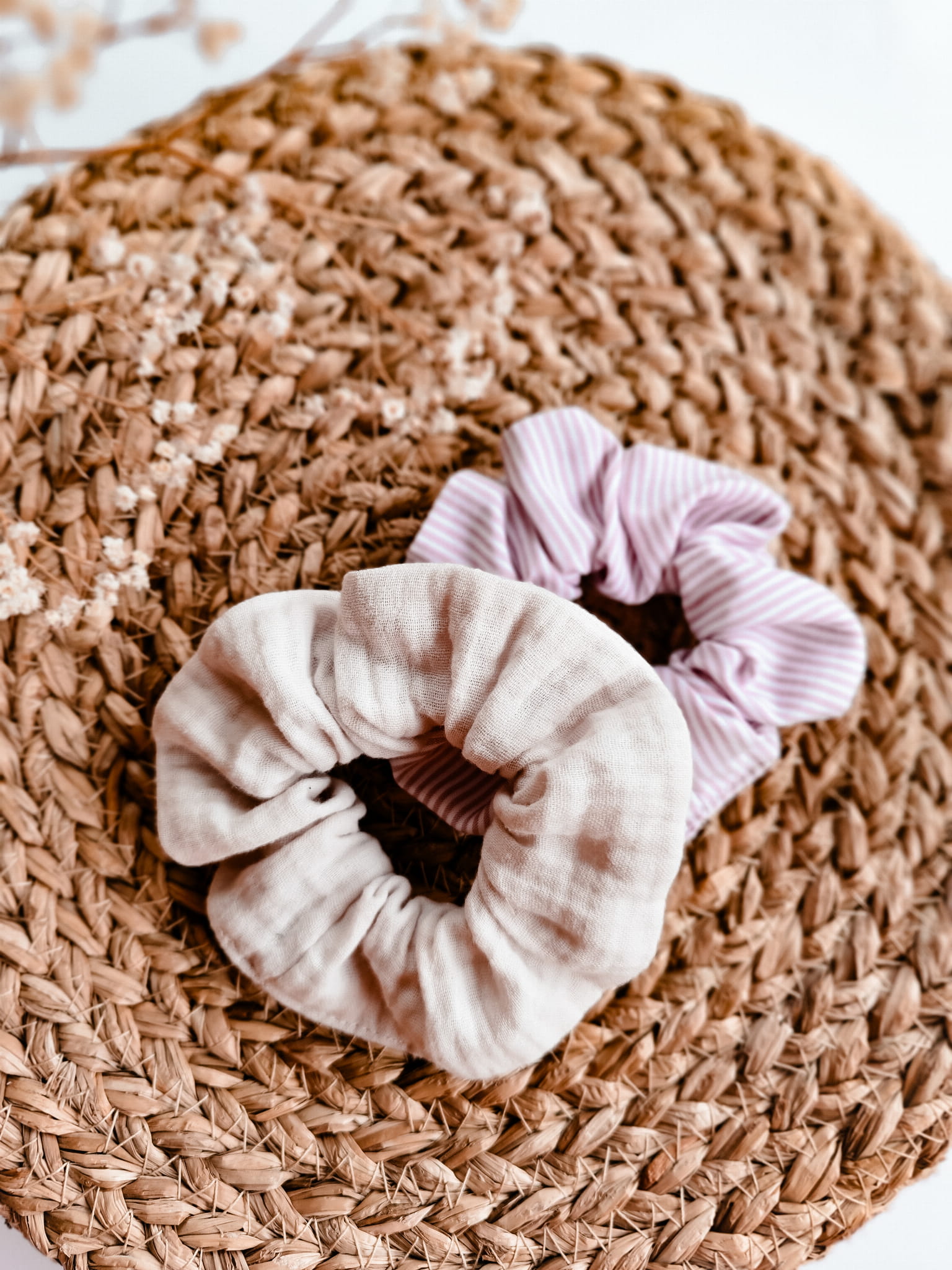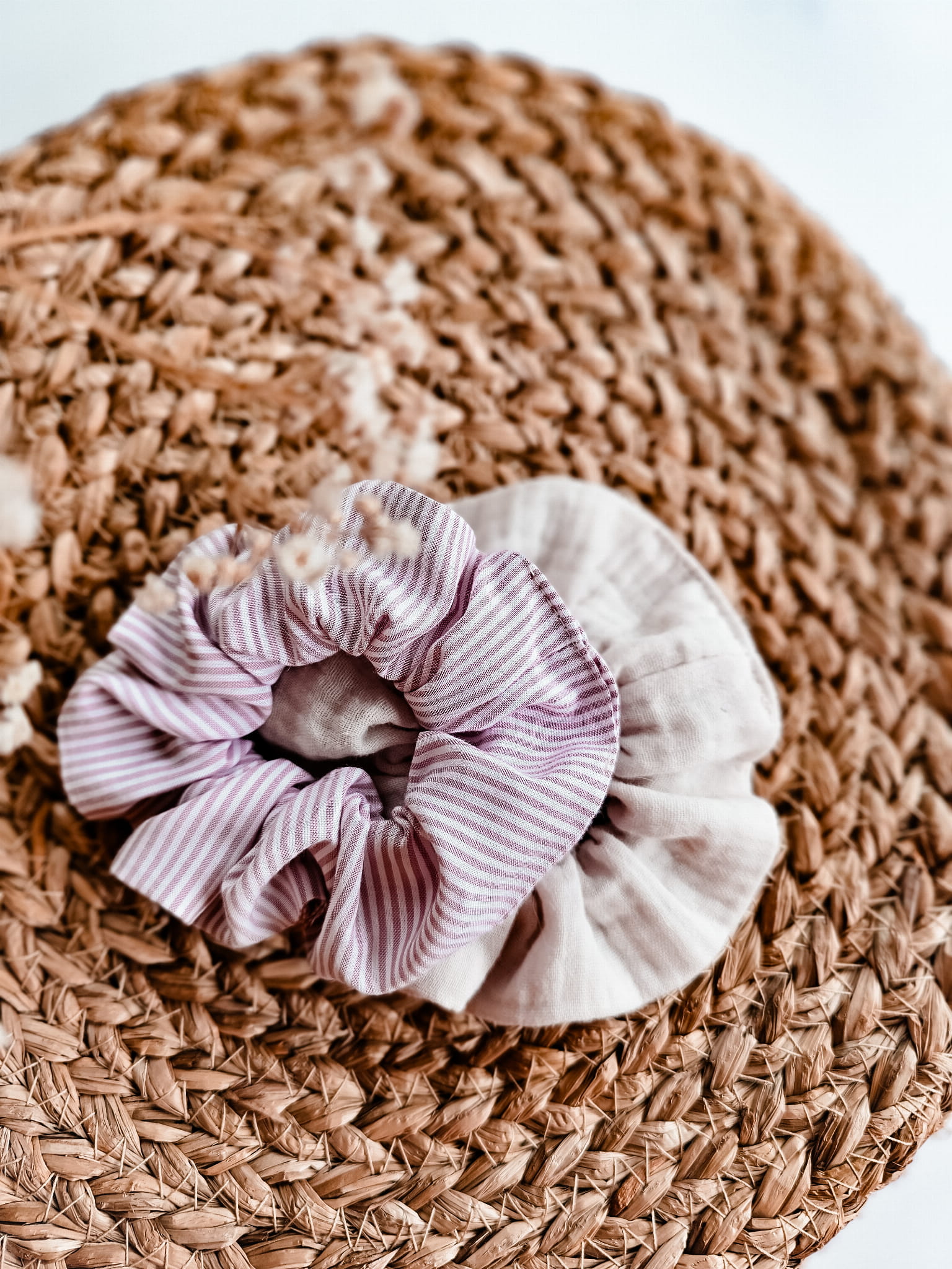 2 Pack zawiera: gumka scrunchie z wiskozy w paski oraz gumka muślinowa.