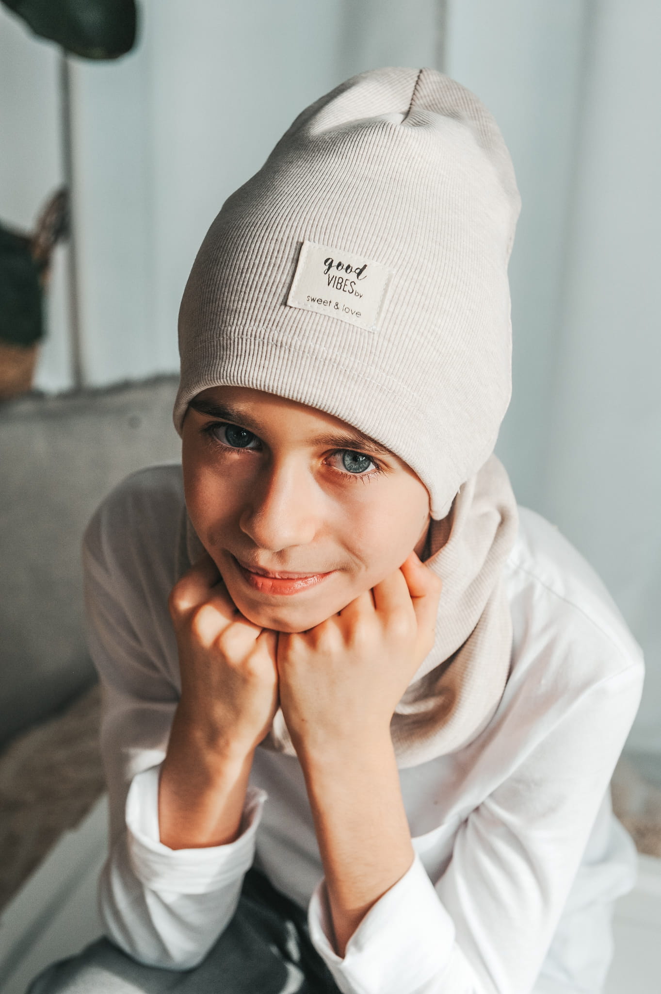 Czapka typu smerfetka jednowarstwowa plus tuba wkladana na raz przez głowę uszyte z dzianiny typu ściągacz.