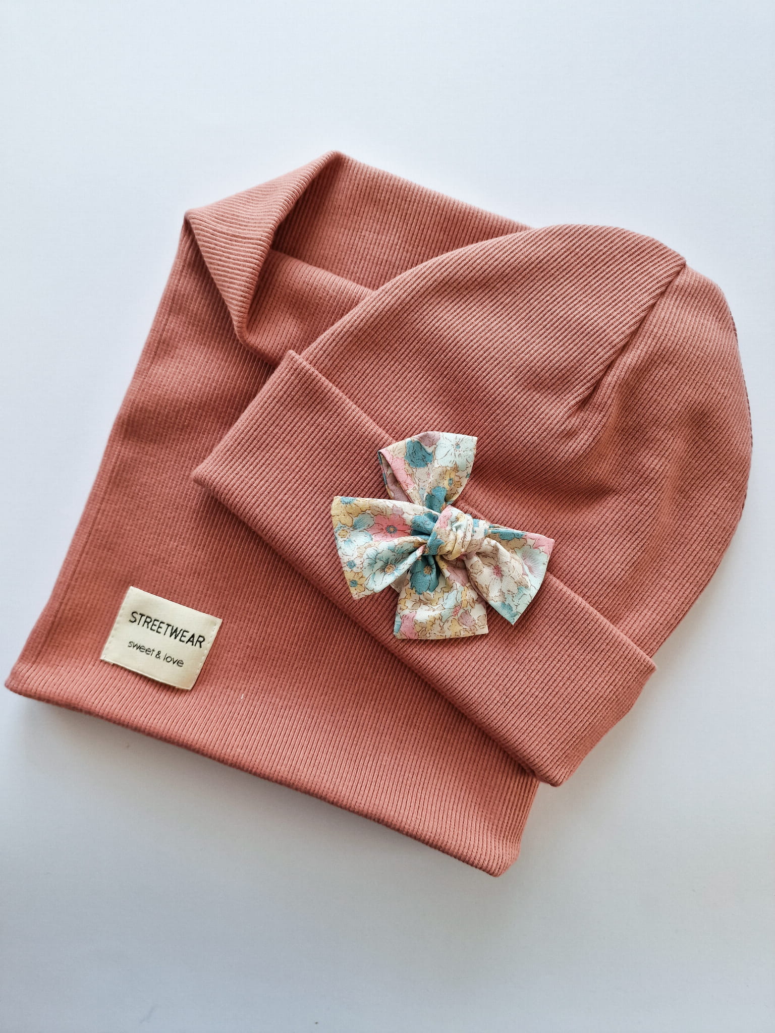 Czapka uszyta z miękkiej dzianiny typu ściągacz plus pastelowych kokarda w kwiatki.