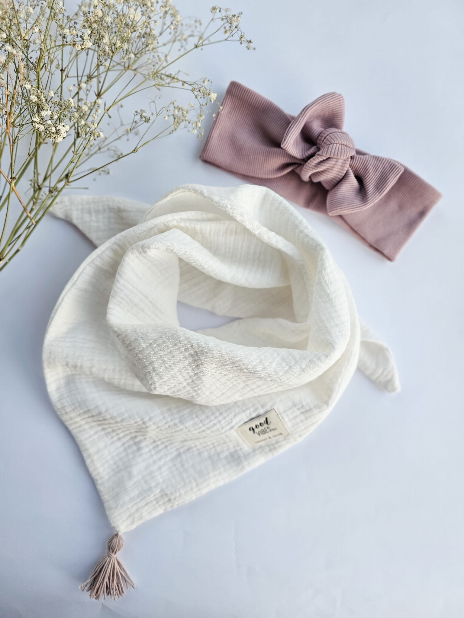 Opaska ładnie się układa. Do kompletu muślinowa dwuwarstwowa chusta z chwostem.