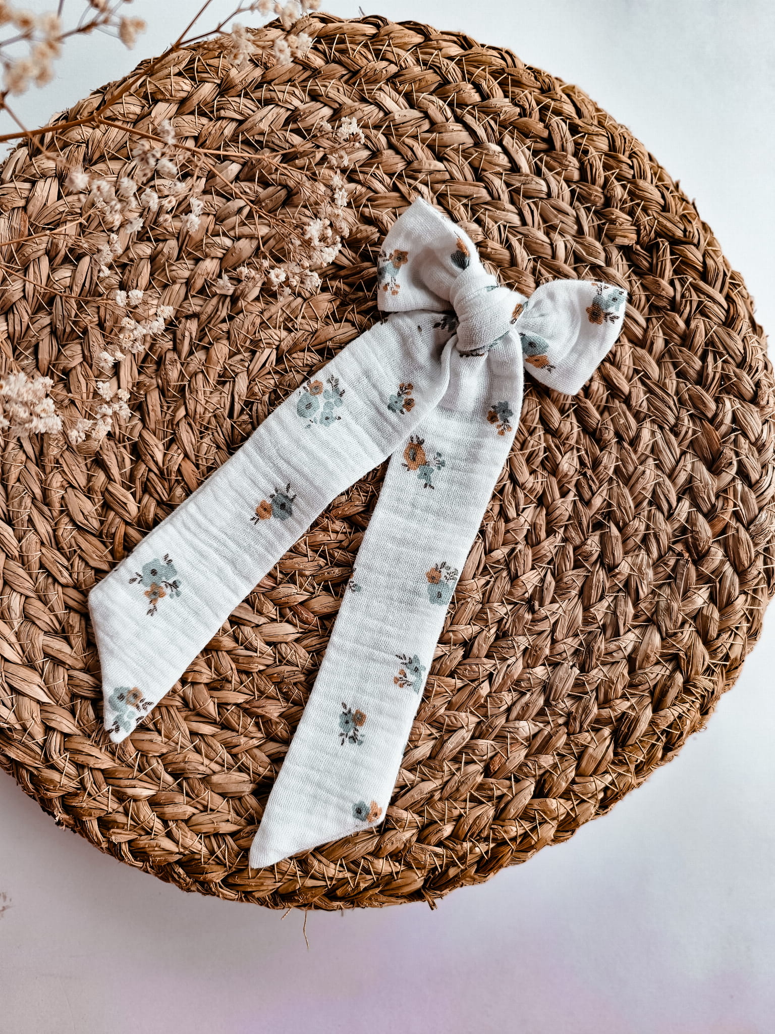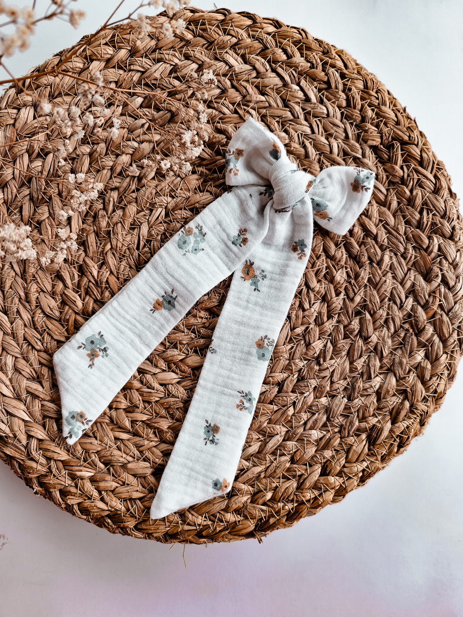 Modna spinka dla dziewczynki duża kokarda biała we wzór kwoatowy