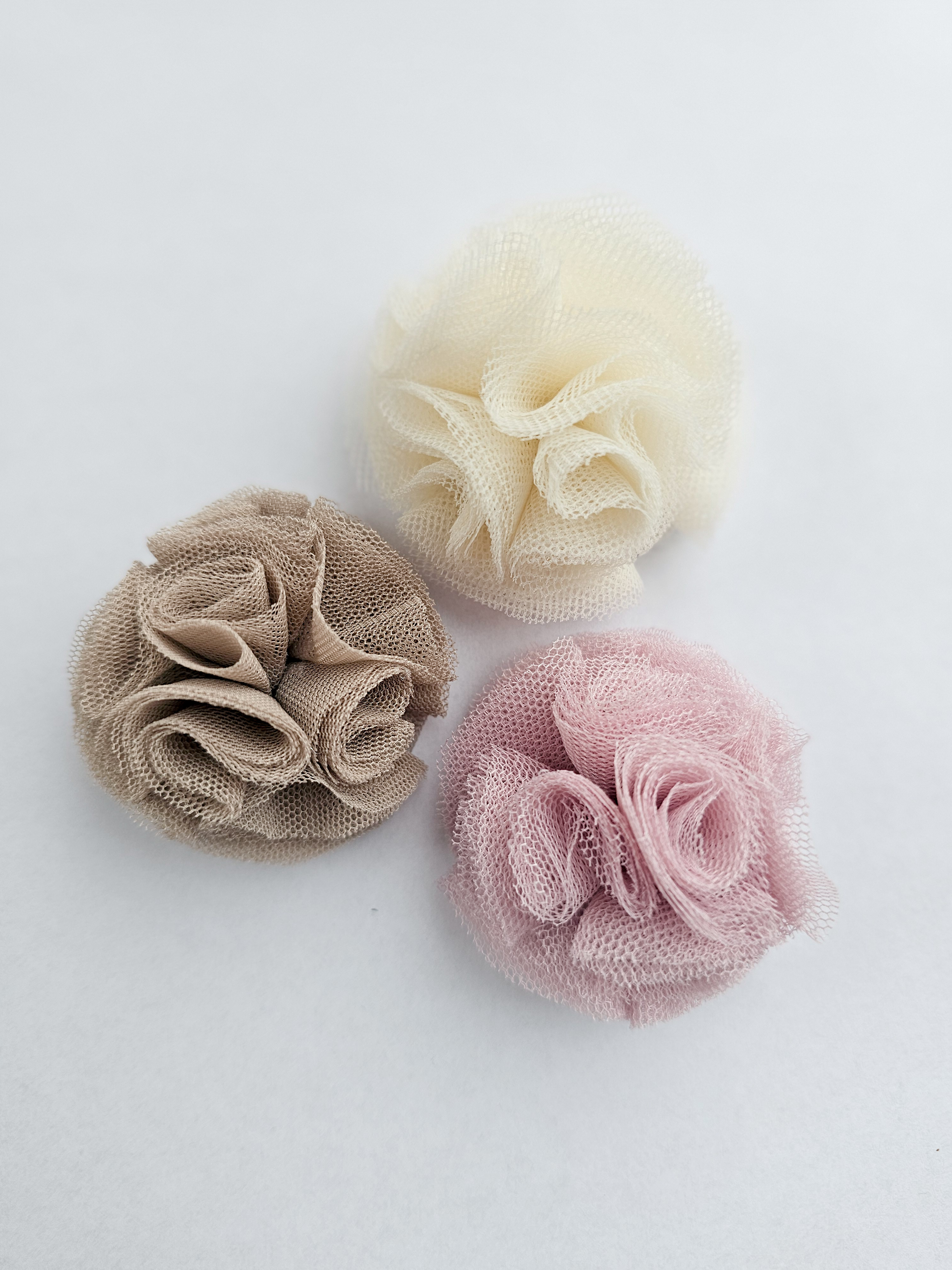 ● Materiał: Ozdoba została wykonana z cienkiej, półprzezroczystej siateczki typu tiul. Brzegi materiału są delikatnie pofalowane, co nadaje całości objętości i sprawia, że kwiatek wygląda na wielowarstwowy.